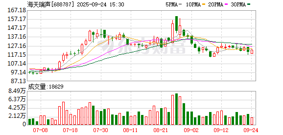 证券时报·数据宝统计显示,海天瑞声今日收盘价为122.22元,上涨1.67%,日换手率为3.09%,成交额为2.27亿元,全天主力资金净流出1656.39万元,近5日该股累计下跌1.95%,近5日资金合计净流出6413.57万元。
